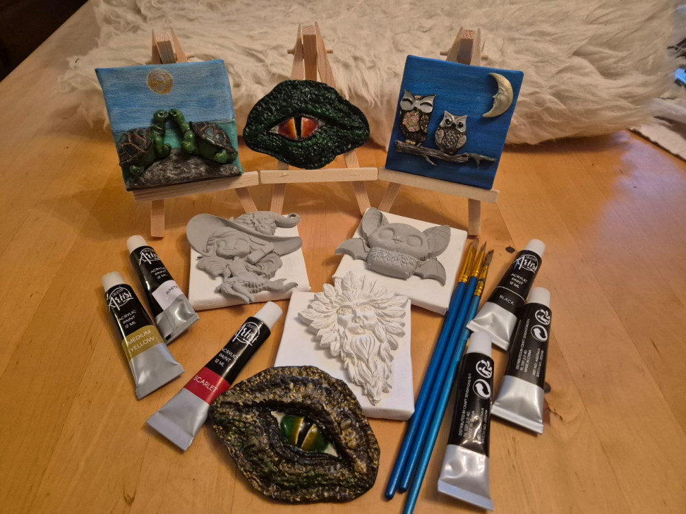 Wir gestalten kleine Kunstwerke auf Mini-Leinwänden ( mit Staffelei). Aus Modelliemasse vorgefertigten Drachen, Hexen, Baumgeistern, Fischen, Eulen, Blumen u.v.m., können kreativ mit Acryfarben bemalt werden.