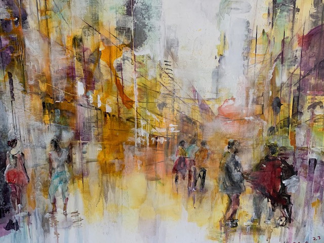 Die meist großformatigen Acryl- und Tuschebilder erzählen Geschichten vom urbanen Leben aber auch von privaten Momenten. Ergänzt werden diese Eindrücke durch einige abstrakte Gemälde mit floralem Charakter.